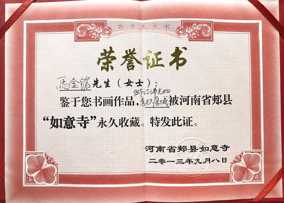 2013年9月8日,马金铭书画作品被河南省郏县“如意寺”永久收藏。