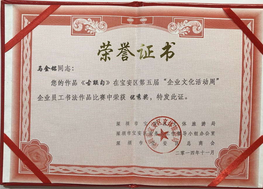 2014年11月,作品《古联句》在宝安区第五届“企业文化活动周”企业员工书法作品比赛中荣获优秀奖。