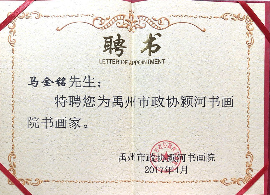 2014年10月8日,特聘马金铭为中国南方书画院第一届副秘书长。